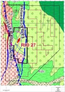 Previous work at the Illapel project has confirmed the importance of generally N-S trending structures, and cross-cutting structures with ocoite dykes, in localizing copper-silver mineralization. Mineralization encountered in drill holes, and at Rio 27 mine, and forms large halos of sulphide-bearing rock. Based on the down-hole geophysical survey, these halos have been proven to form zones of low-resistivity mineralization that respond to EM.